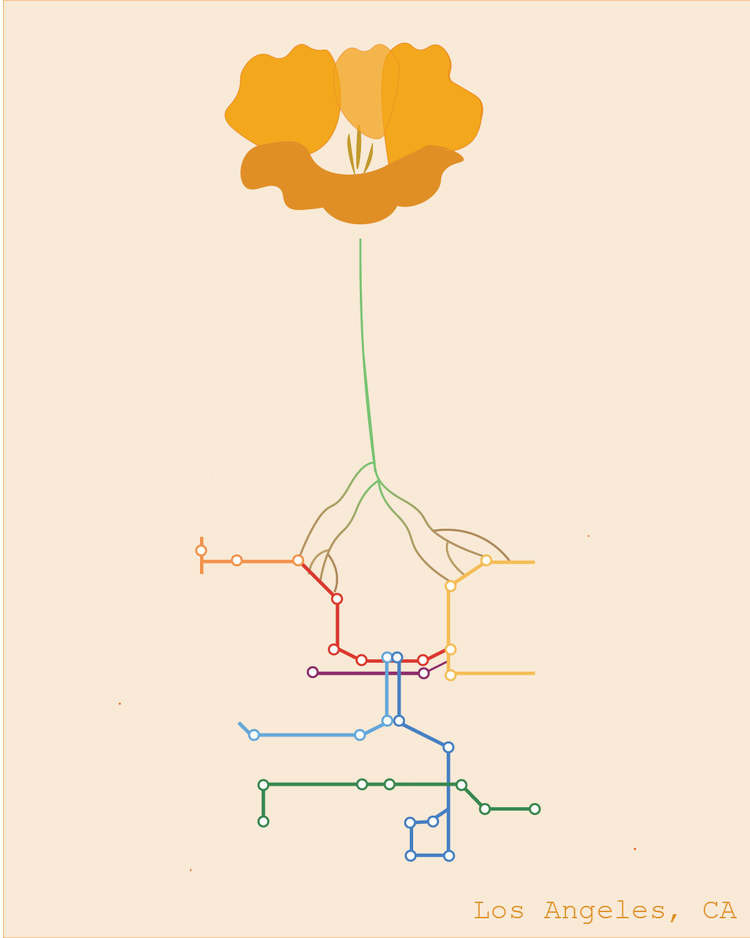 And the third postcard, “Transit”, maps Los Angeles's transit system, how bodies move across neighborhoods. It represents large-scale infrastructure, the visible systems that organize urban mobility and access."