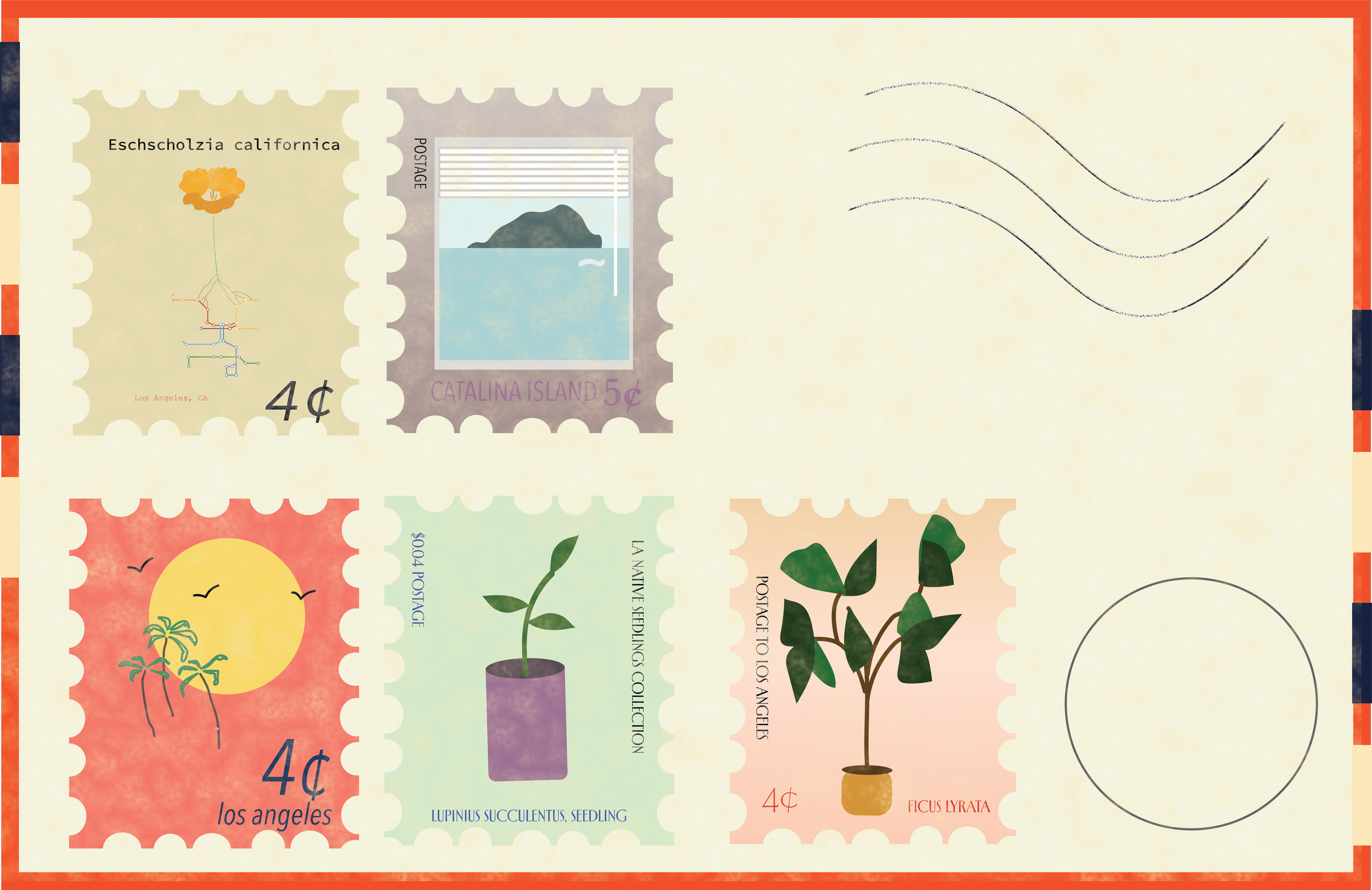The second postcard, “Infrastructure of Communication”, features stamps depicting elements of living infrastructure, nature-based systems that support urban life in Los Angeles.